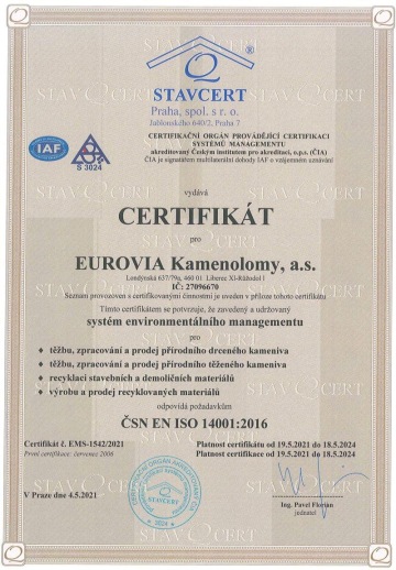 Certifikát EMS dle ČSN EN ISO 14001:2016