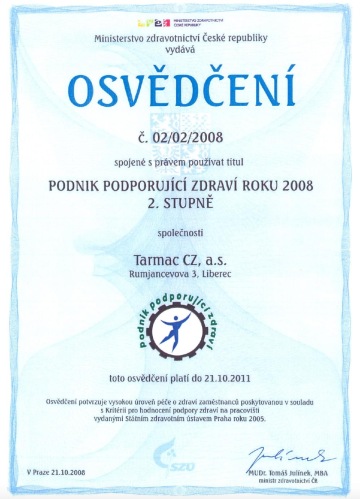 Our company was audited by the State Institute of Health in Prague in 2005. The purpose of the audit was to review health protection practices at our workplaces. During both the preparatory stage and the audit itself, we were able to present our views, defend our procedures and seek ways to achieve further improvement. The finding of the 2005 audit earned us the honorary title of “Health-supporting Business”, bestowed by the Ministry of Health of the Czech Republic. In 2008, we were deemed to have achieved further improvements and we maintained the quality of our processes and defended our title successfully in 2011 – in that year, we were already in cooperation with colleagues from EUROVIA Stone CZ, s.r.o.